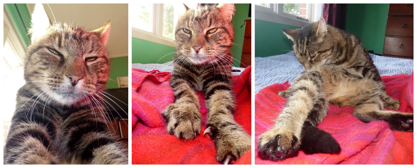 He moved in and stole our hearts one by one. The weekend was a wet and cold sort and I had developed a snotty nose so me and Big spent a lot of time lying on top of the Spares bed chilling together, me reading and him purring. He has a big as motor of course and he loves to head butt you.